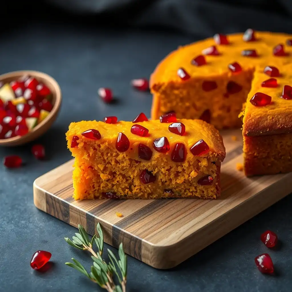 Retirar el bizcocho del vapor y dejarlo reposar en el molde unos 10 minutos antes de desmoldar. Dejar enfriar completamente sobre una rejilla. Decorar con semillas de granada justo antes de servir.