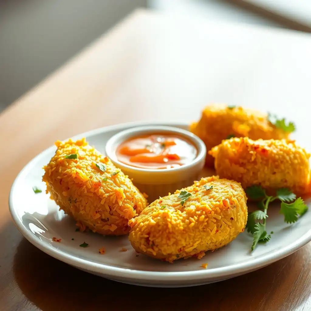 Sirve las bolitas de maíz crujientes tibias, acompañadas de la salsa de ají amarillo. Decora con hojas de cilantro fresco y flores comestibles para un toque final.