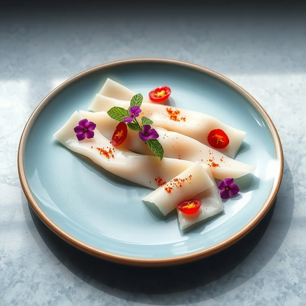 Espolvorea el eneldo fresco picado uniformemente sobre las vieiras marinadas. Añade los rábanos laminados y decora con flores comestibles si lo deseas, buscando un equilibrio visual.