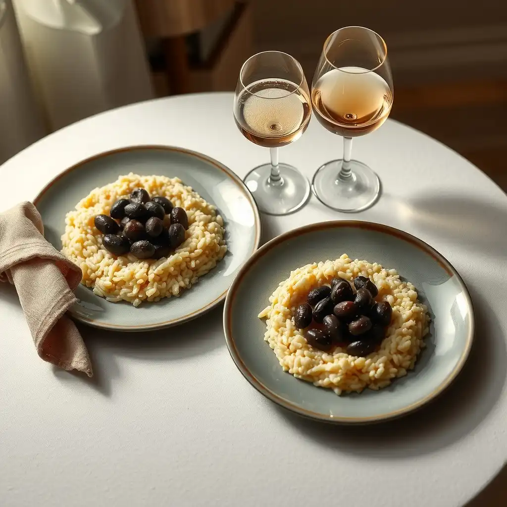 Sirve el risotto inmediatamente en platos calientes. Lamina la trufa negra fresca sobre cada porción con una mandolina o rallador de trufa. Espolvorea con perejil fresco picado.