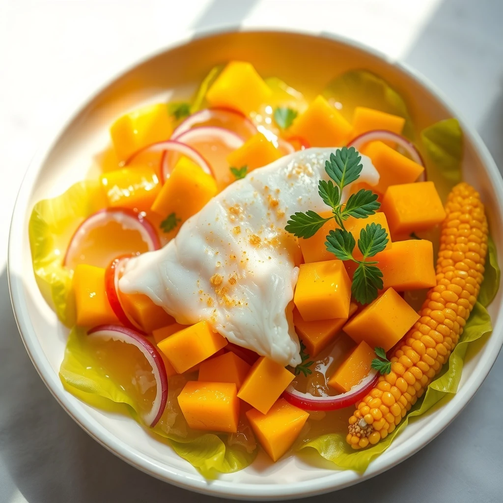 Probar y ajustar la sazón con sal y pimienta si es necesario. Servir inmediatamente sobre hojas de lechuga, acompañado de rodajas de camote cocido y maíz tierno.