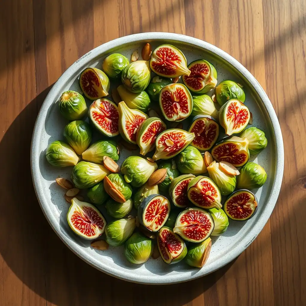 Sirve las coles de Bruselas rostizadas y los higos en un plato. Rocía generosamente con el aderezo preparado. Espolvorea las almendras laminadas tostadas por encima para darle ese toque crujiente que tanto nos gusta. ¡A disfrutar de lo mejor de la temporada!