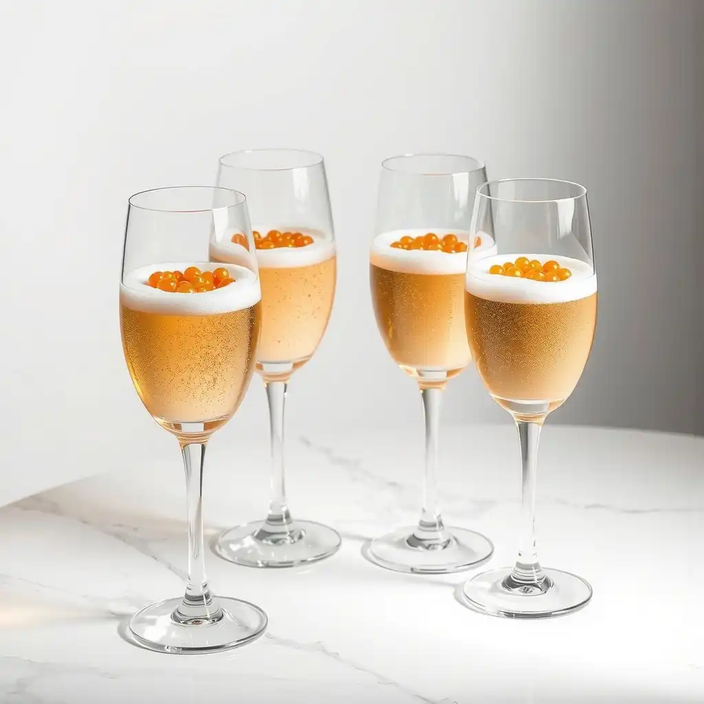 Colocar una porción del caviar de Beluga sobre la espuma de champagne en cada copa, asegurando que las perlas de azafrán se distribuyan armoniosamente.