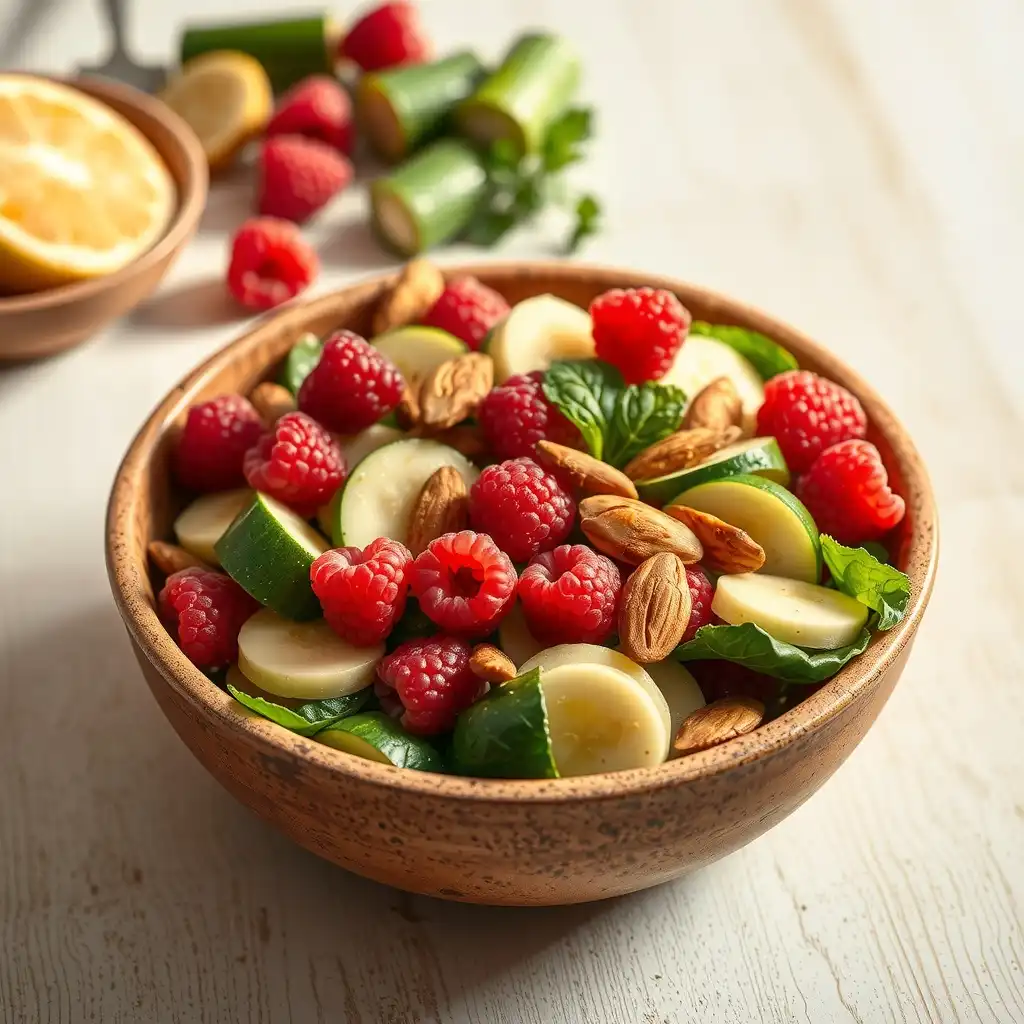 Viste la ensalada y añade el toque cristalino: Vierte la vinagreta sobre la mezcla de Zapallito y frambuesas. Remueve con suavidad para que todos los sabores se abracen. Incorpora el crocante de almendras caramelizadas justo antes de servir, asegurando su textura crujiente.