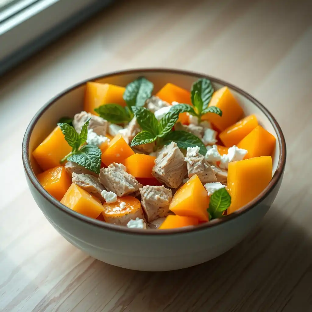 En un bol mediano, combina los cubos de melón maduro y la pechuga de pavo cocida. Asegúrate de que los ingredientes estén a temperatura ambiente o ligeramente fríos para una experiencia refrescante.