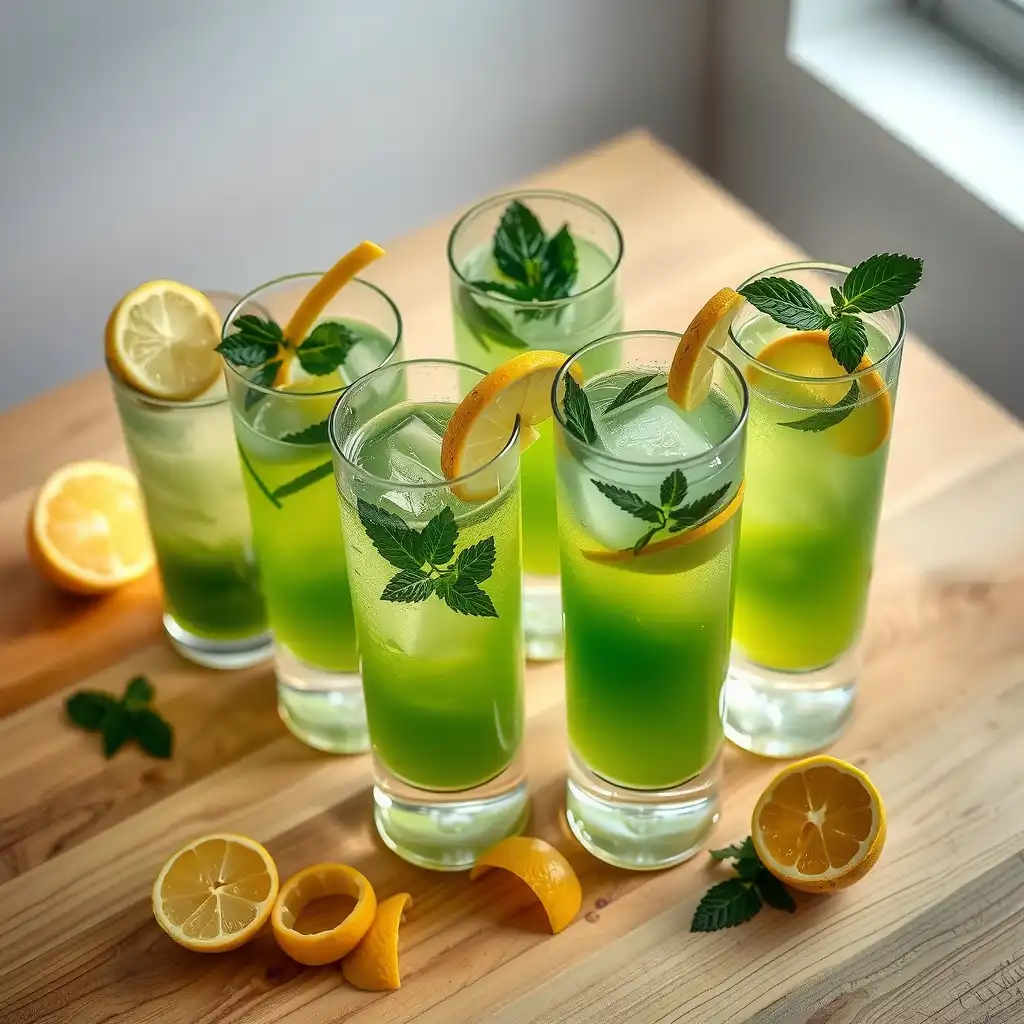 Sirve el Elixir Verde en vasos individuales. Decora cada vaso con una rodaja fina de pepino, una rodaja de limón y unas hojas de menta.