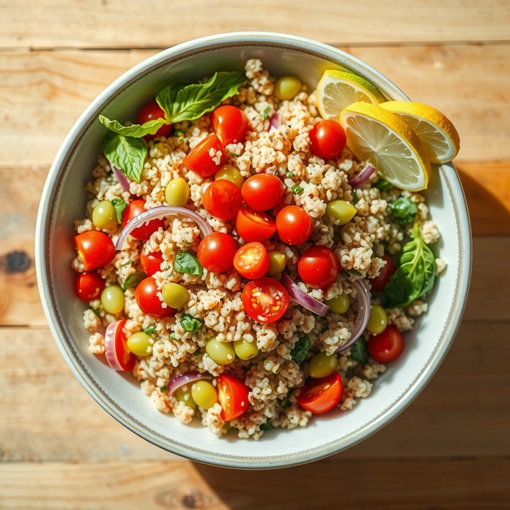 Mientras la quinoa se cocina, prepara el aderezo. En un tazón pequeño, bate el zumo de limón, el aceite de oliva virgen extra, la sal marina y la pimienta negra recién molida hasta que estén bien combinados. Reserva.