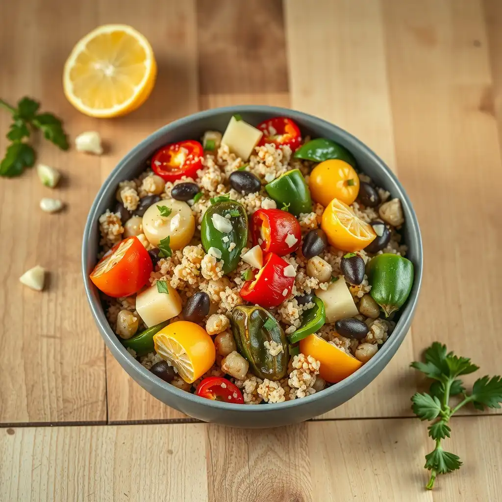 En un bol grande, combinar la quinoa cocida, las verduras rostizadas y las almendras tostadas. Verter la vinagreta sobre la ensalada y mezclar suavemente. Incorporar la menta y el perejil picados justo antes de servir.