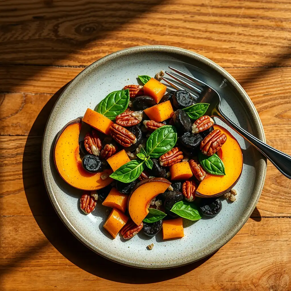 Servir la ensalada templada en platos individuales. Espolvorear con las nueces pecanas tostadas picadas antes de servir.