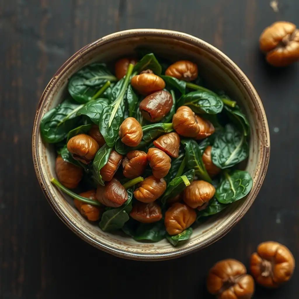 Sirve inmediatamente. Este plato es perfecto como acompañamiento de carnes, pescados o como plato principal ligero. Se disfruta mejor recién hecho, cuando las espinacas están tiernas y las castañas crujientes.