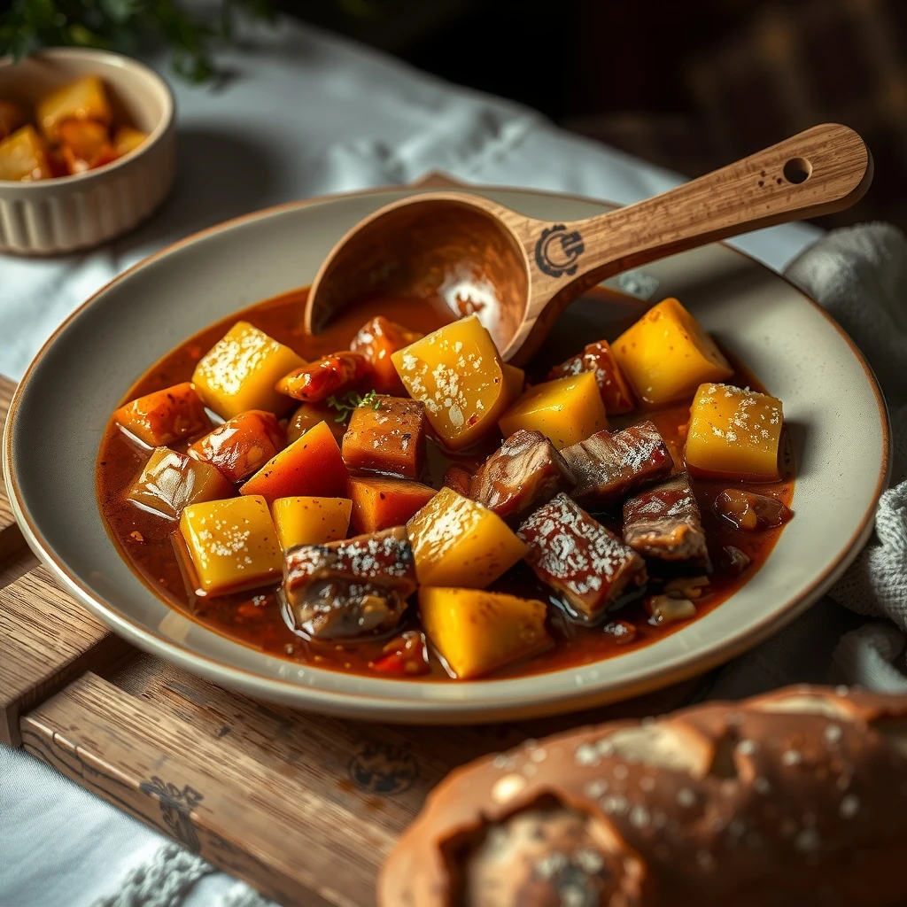 Continúa cocinando a fuego muy bajo o en el horno durante 1.5 a 2 horas más, o hasta que las papas estén tiernas y el guiso haya espesado. Ajusta la sazón si es necesario.