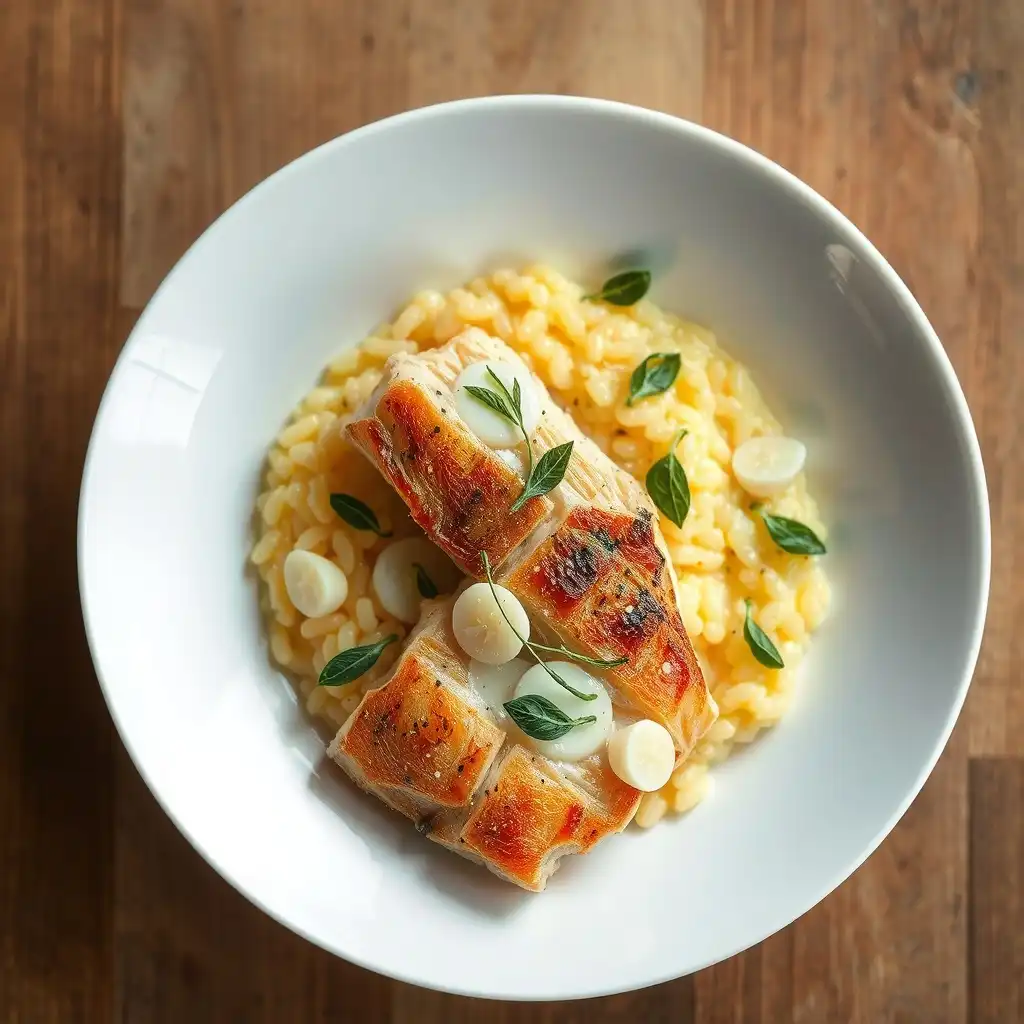 Sirve el risotto cremoso en platos hondos. Coloca un filete de salmón jugoso encima de cada porción de risotto. Decora con perejil fresco picado.
