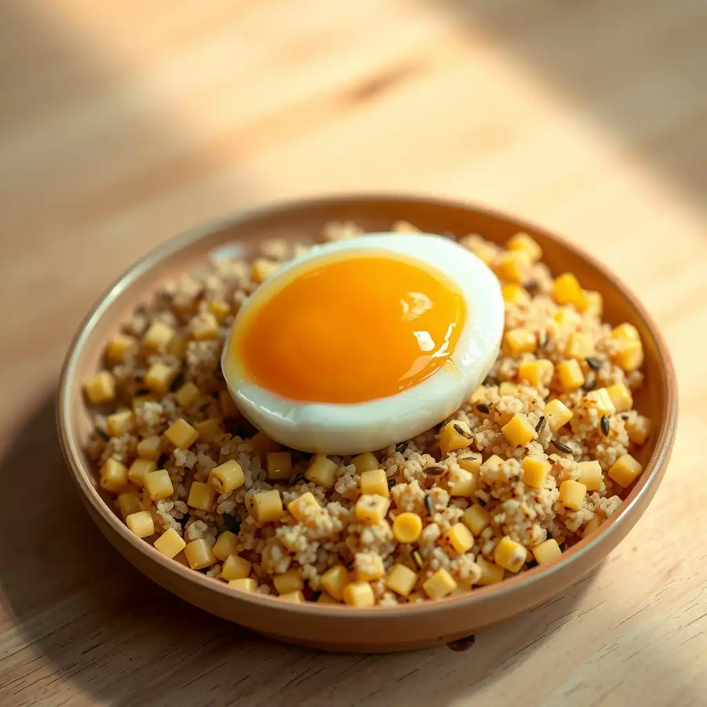 Montaje: sobre un plato hondo, sirve una base generosa de quinua cocida. Cubre con una porción del choclo cremoso. Con cuidado, coloca un huevo confitado en el centro de cada plato. Decora con cilantro fresco picado y, si lo deseas, un poco de chile picado.