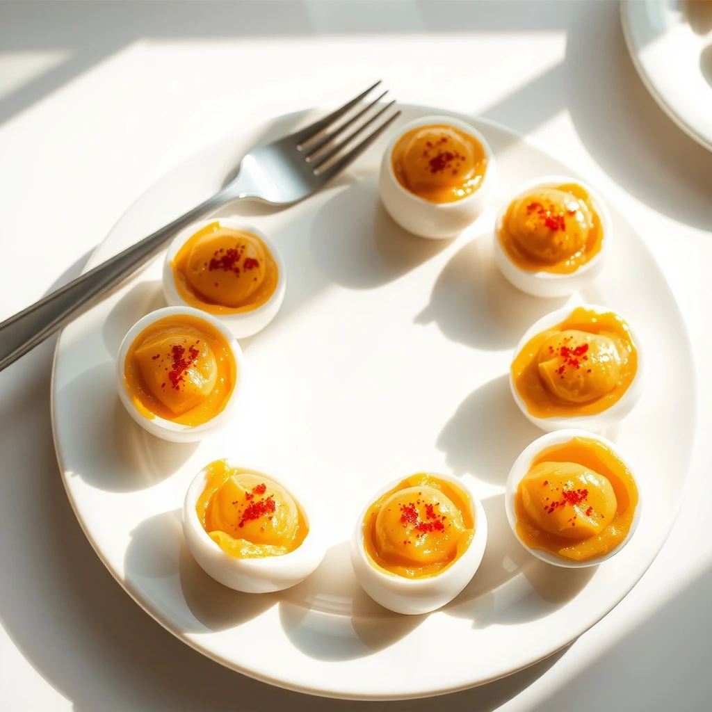 Espolvorear un poco de pimentón dulce sobre cada huevo relleno para darle color y un toque extra de sabor. Servir inmediatamente como almuerzo o cena ligera.