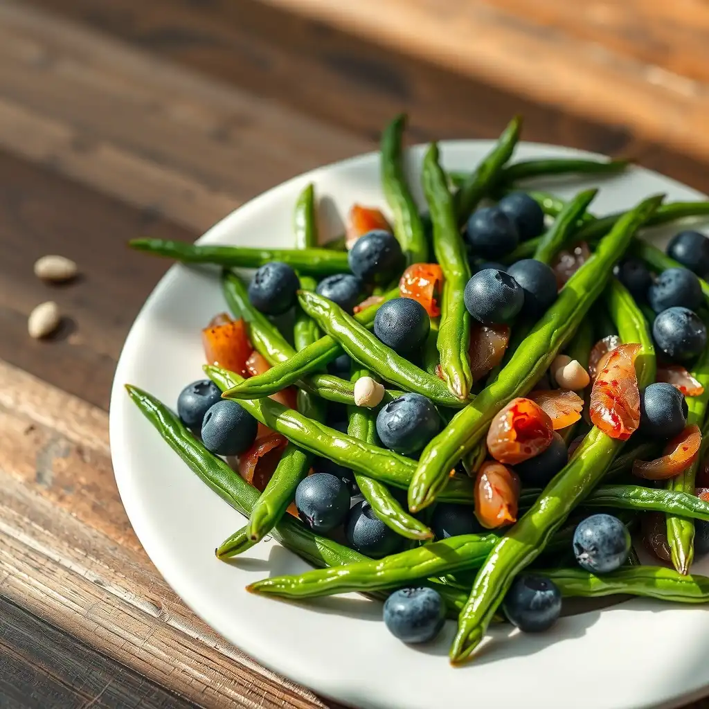 Incorporar las vainas de cardamomo ligeramente trituradas a la sartén y cocinar por 1 minuto más, liberando su fragancia exótica. Añadir las judías verdes blanqueadas y las hojas de tomillo fresco. Remover para combinar.