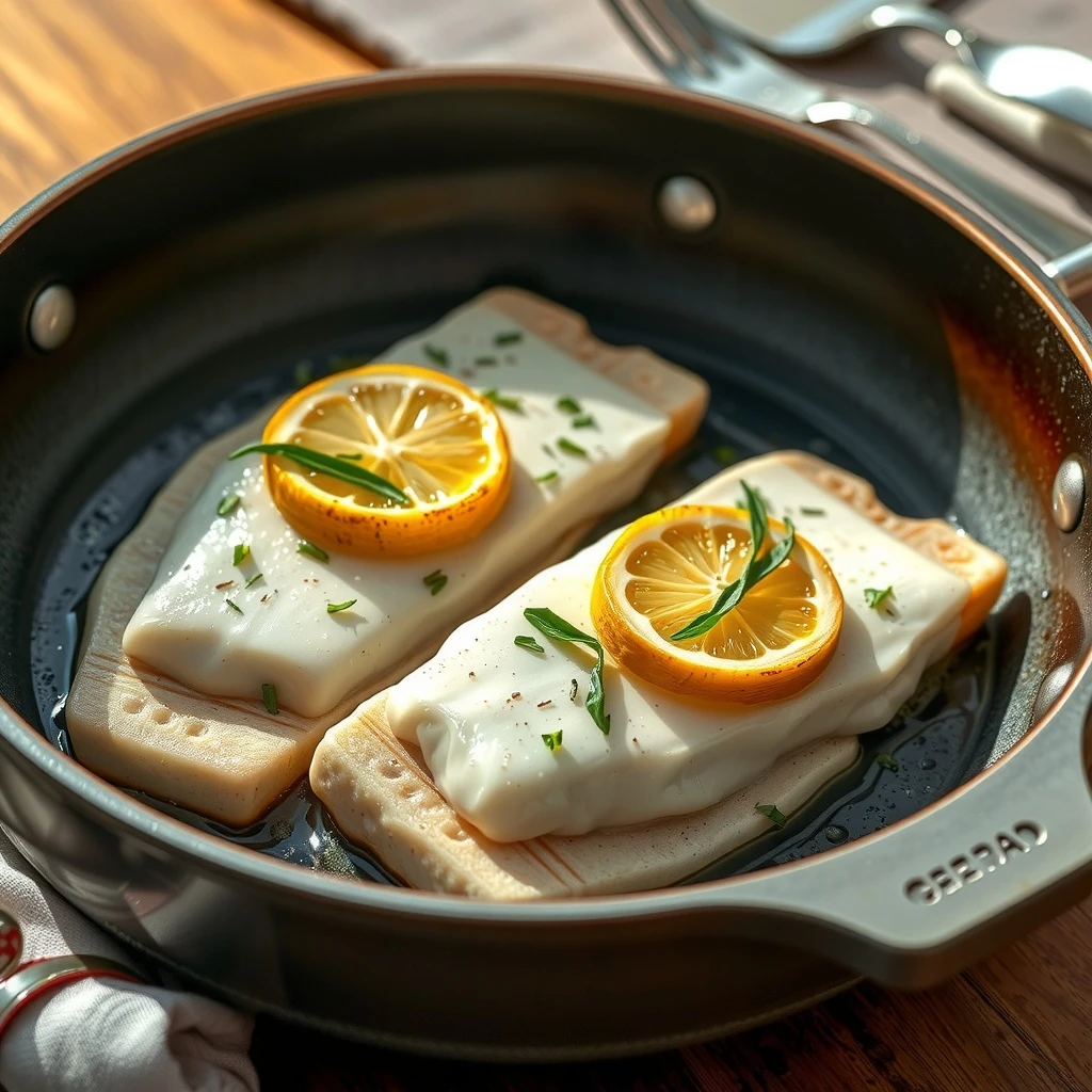 Distribuir uniformemente el ajo picado, las alcaparras picadas, las ramitas de romero y tomillo sobre los filetes de pescado. Colocar rodajas finas de limón sobre cada filete.
