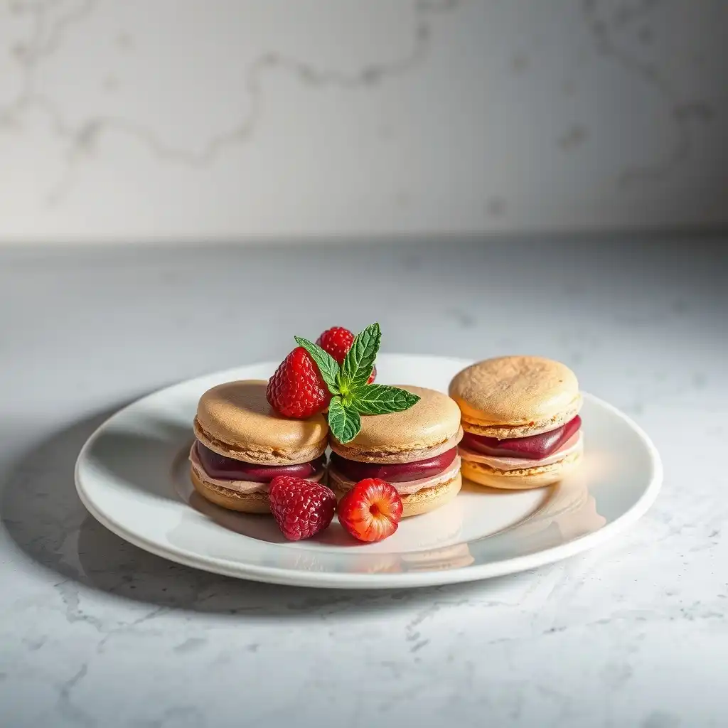 Rellenar los macarons: Unir pares de bases de macaron con la ganache de frambuesa usando una manga pastelera.