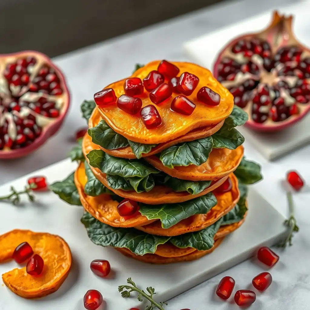 Montar los milhojas: colocar una capa de puré de Zapallo en la base, seguida de una capa de acelgas aderezadas, y coronar con chips crujientes de Zapallo. Repetir la estructura hasta terminar.