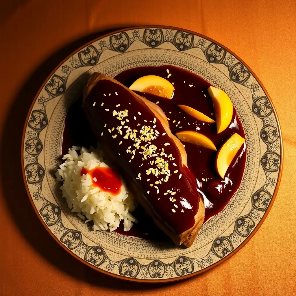 Dejar reposar el pato glaseado por unos minutos antes de cortarlo en rebanadas gruesas. Servir el pato sobre una cama de mole, adornar con semillas de sésamo tostadas y acompañar con arroz blanco o tortillas calientes.