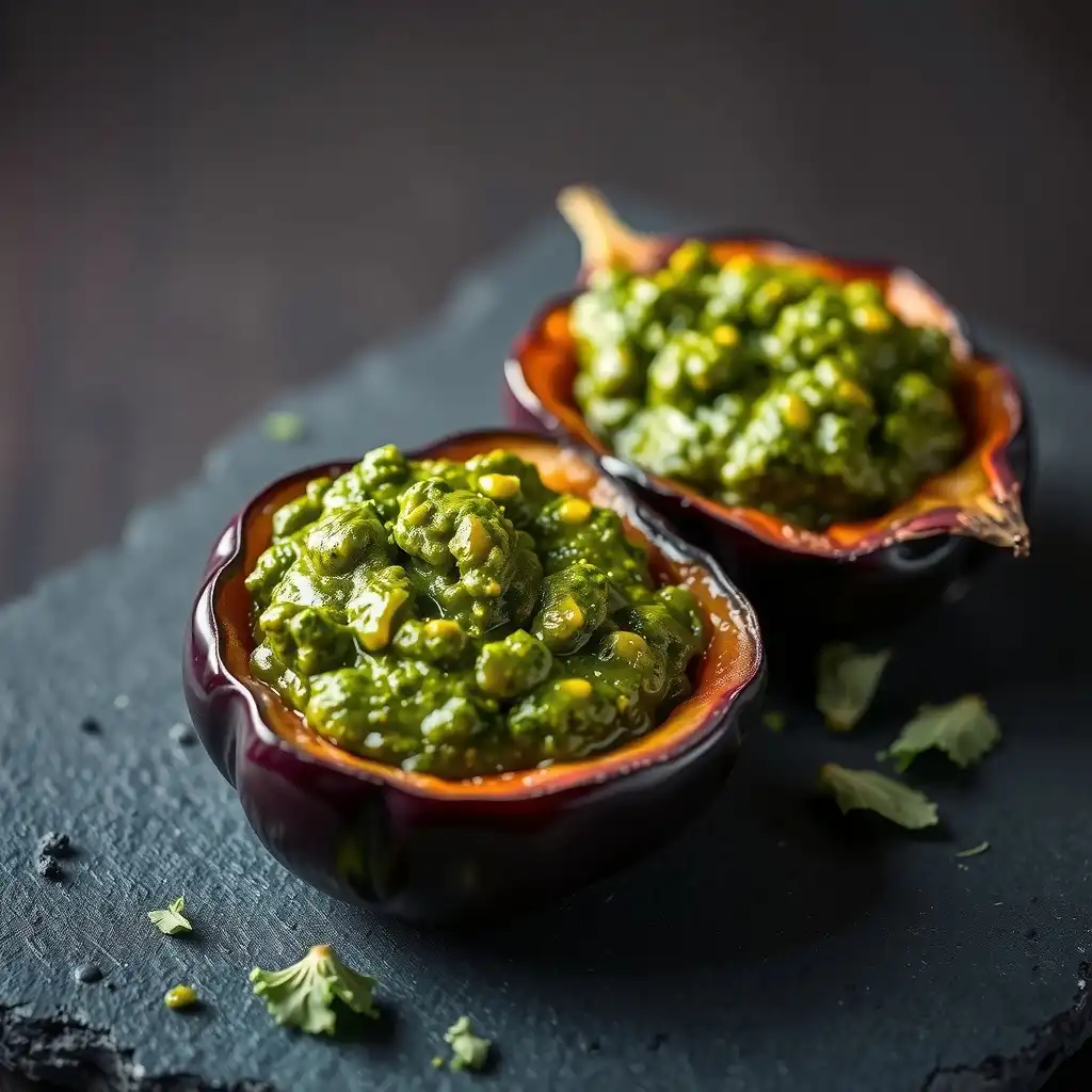 Una vez horneadas, retirar las berenjenas y abrirlas suavemente para formar 'nidos'. Rellenar generosamente cada cavidad con el pesto fresco preparado. Servir inmediatamente.