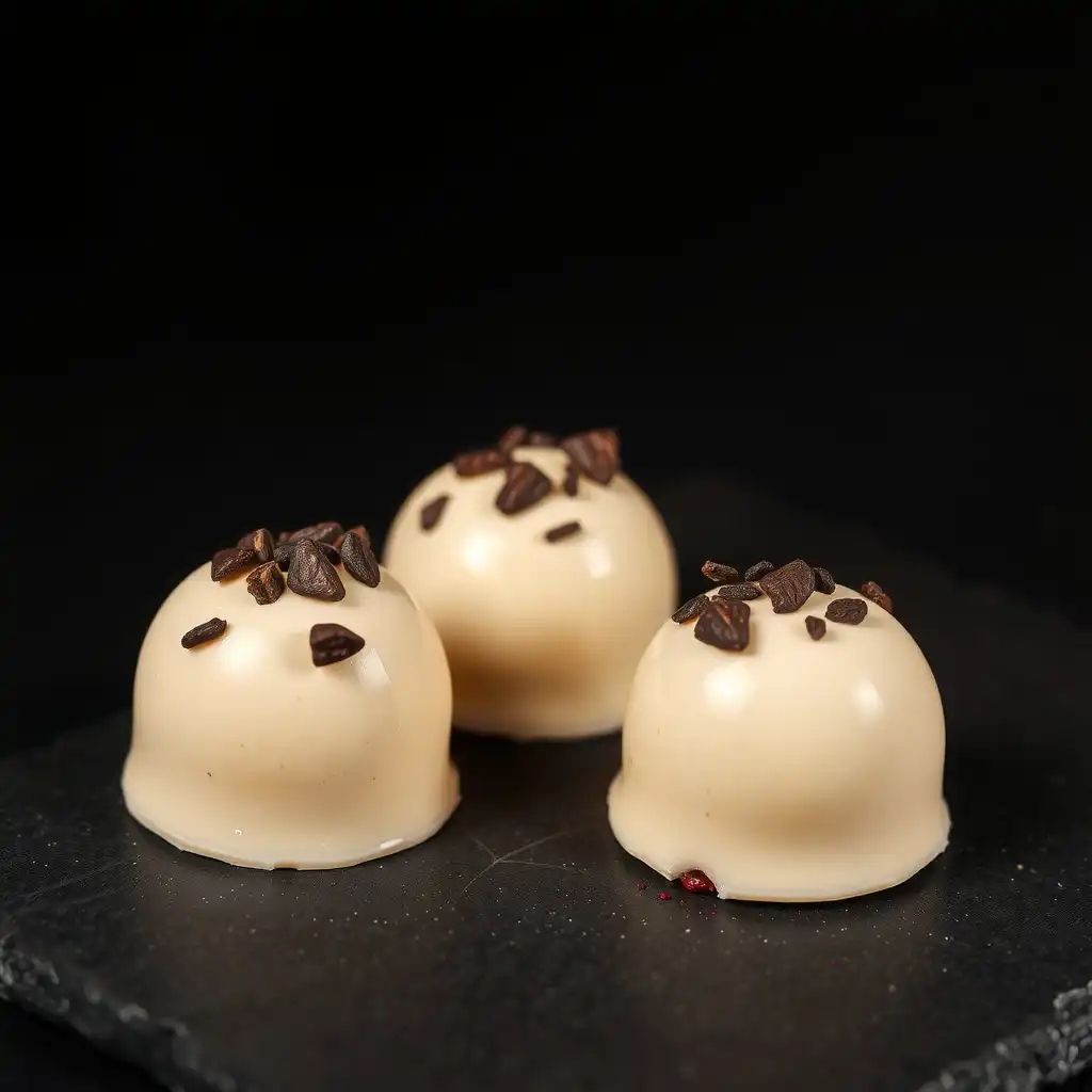 Desmolda los bombones y, si deseas, decora con unos pocos nibs de cacao para aportar un toque crujiente y visual, evocando los destellos en la noche estrellada.