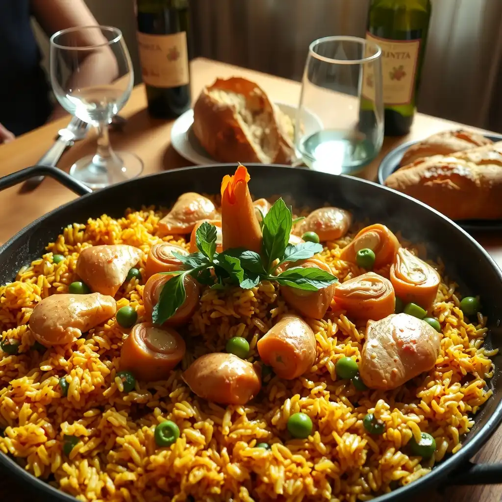 Reduce el fuego a medio-bajo. Coloca la ramita de romero fresco en el centro de la paella y cocina durante otros 5-8 minutos, o hasta que el arroz esté tierno y el caldo se haya consumido casi por completo. Evita remover el arroz en esta etapa.