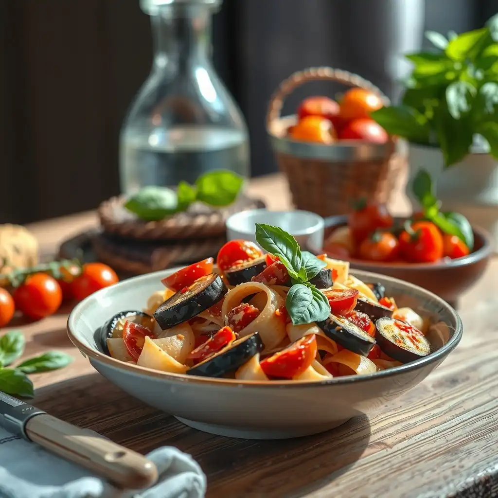 Incorporar las berenjenas asadas a la sartén con los tomates. Añadir el queso ricotta y 100 ml de caldo de verduras (o agua de cocción de la pasta). Mezclar bien hasta que el ricotta se disuelva y forme una salsa cremosa.