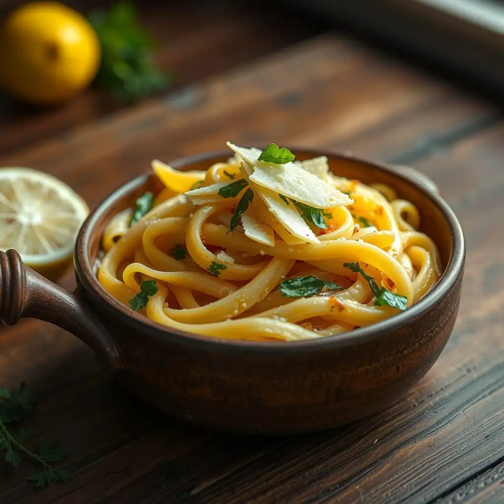Añade la pasta escurrida a la sartén con el ajo. Vierte la mitad del agua de cocción reservada y el zumo de limón fresco. Remueve vigorosamente para emulsionar y crear una salsa ligera.