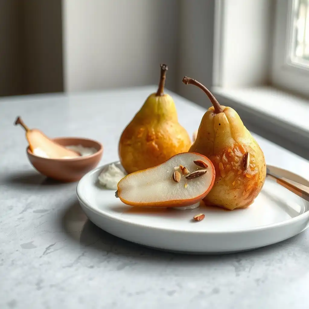 Rellena generosamente las cavidades de las peras con la mezcla de almendras. Coloca las peras rellenas en una fuente para hornear ligeramente engrasada.