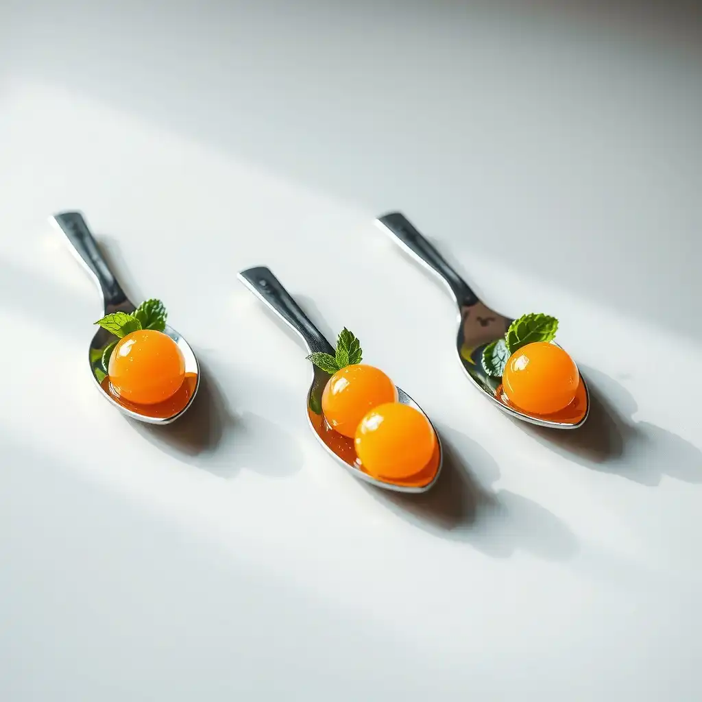 Presentación teatral: sirve las perlas de mango glaseado en pequeñas cucharillas de degustación individuales. Espolvorea generosamente con menta fresca finamente picada. Sirve inmediatamente para disfrutar de su explosión de sabor y textura.