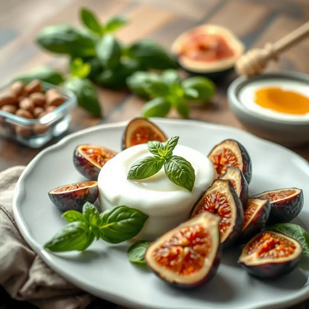 Finaliza adornando cada porción con los cuartos de higo fresco y los pistachos tostados picados. Añade una hoja entera de albahaca en cada plato para un toque de frescura visual. Sirve inmediatamente y disfruta de esta creación matutina.