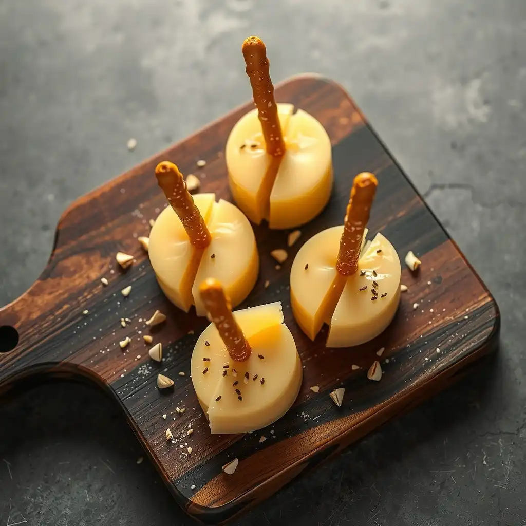 Inserta un palito de pretzel o brocheta en la base de cada montículo de queso.