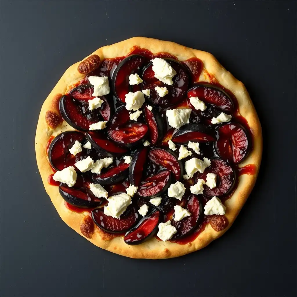 Distribuye las ciruelas salteadas y el queso de cabra desmoronado uniformemente sobre las bases de pizza. Esparce también el queso azul suave por encima.