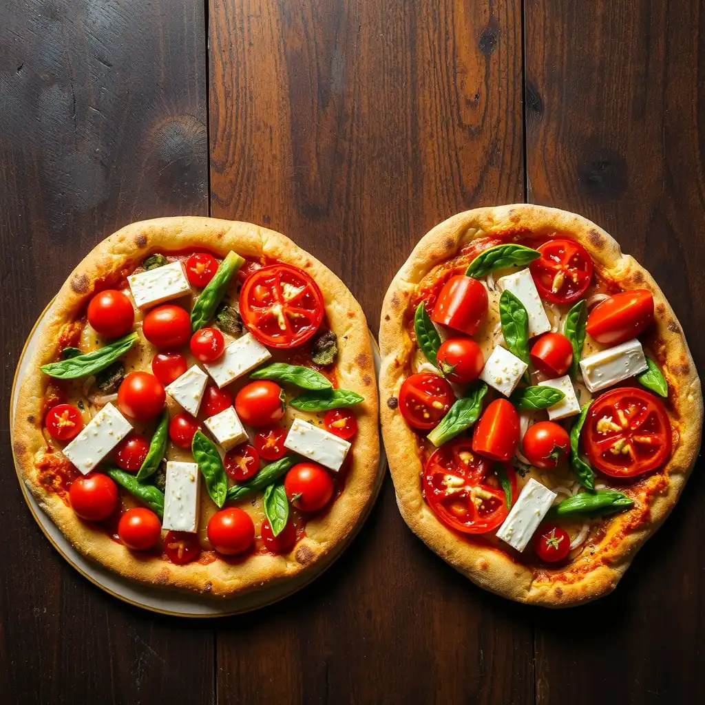 Retira las pizzas del horno. Desmenuza el queso de cabra fresco por encima y decora generosamente con hojas de albahaca fresca. ¡Sirve inmediatamente para disfrutar su frescura!