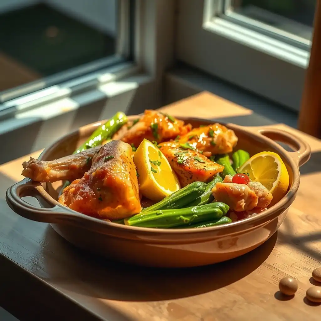 Verter el caldo de pollo y el zumo de limón en la sartén. Raspar el fondo de la sartén para incorporar los jugos dorados del pollo. Llevar a ebullición y luego reducir el fuego.
