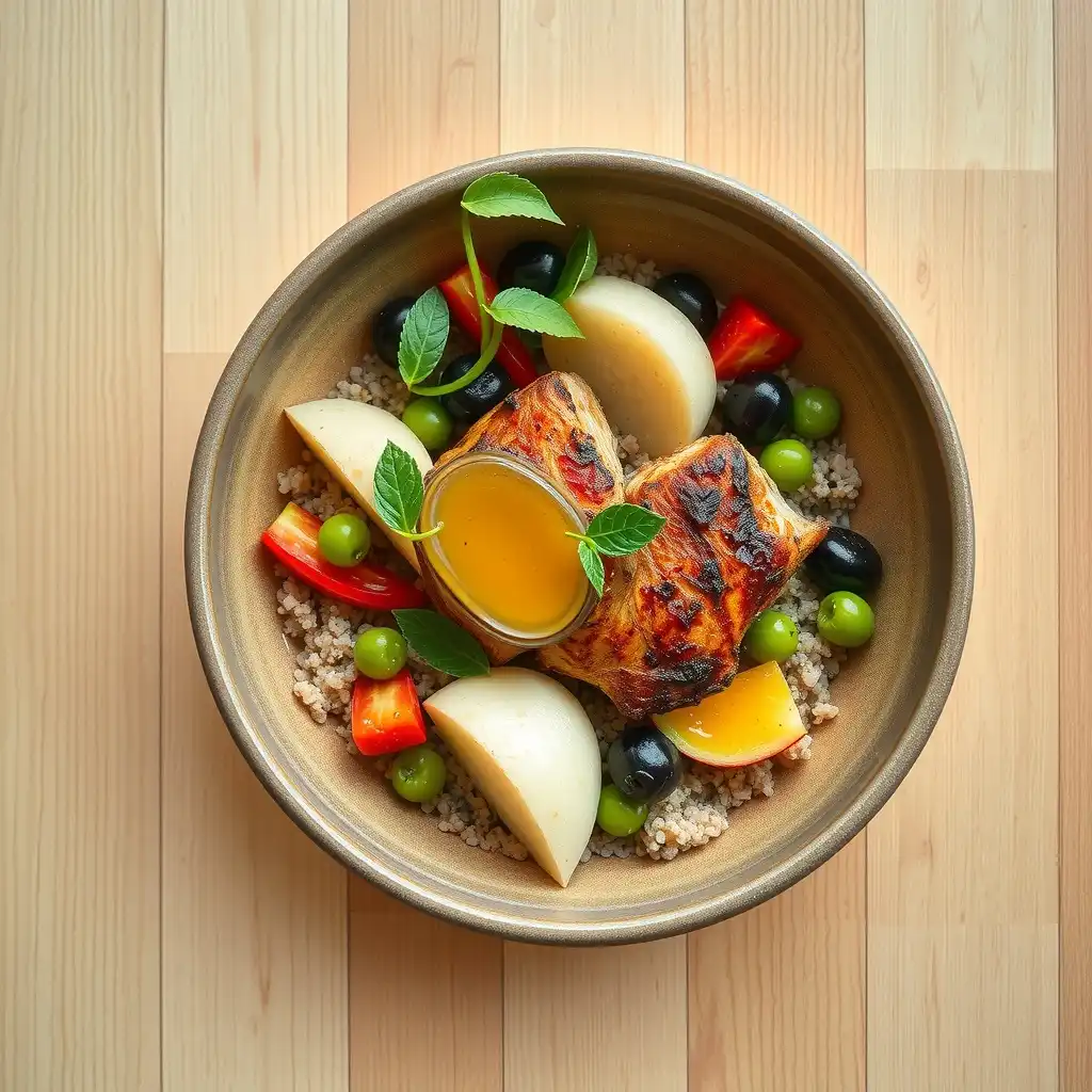 Mientras la quinoa se cocina, calienta 1 cucharada de aceite de oliva en una sartén grande a fuego medio-alto. Añade los trozos de pollo marinado y cocina hasta que estén dorados y bien cocidos por dentro, aproximadamente 6-8 minutos. Retira el pollo de la sartén y reserva.