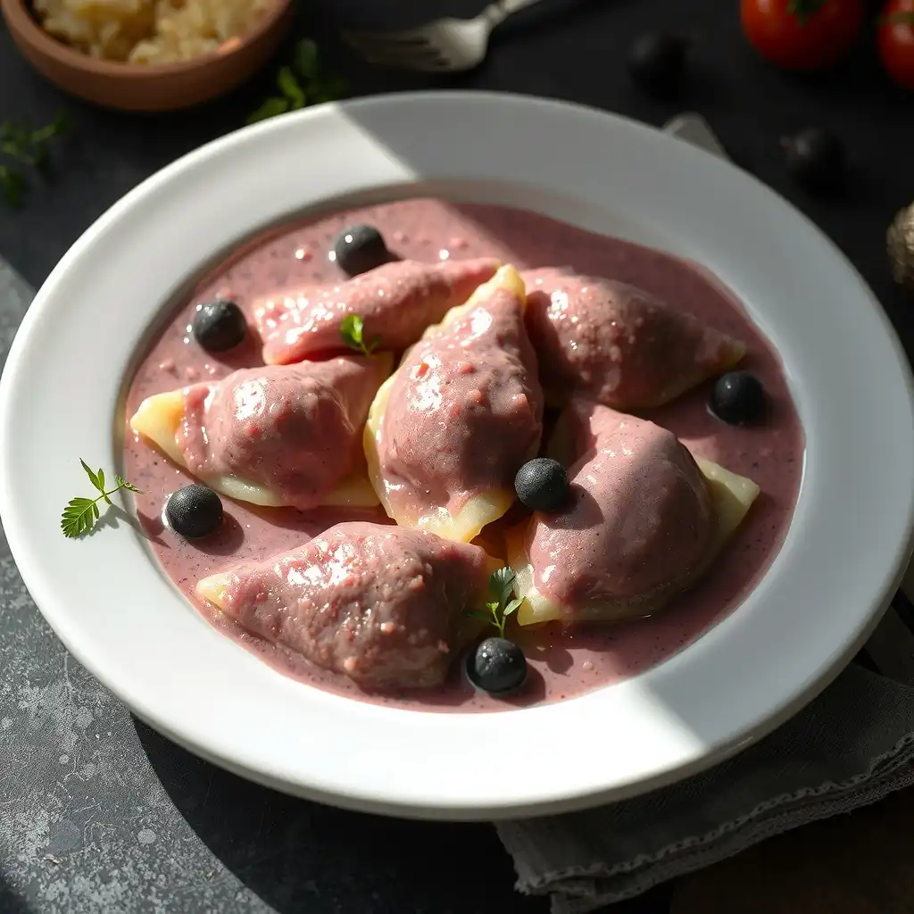 Servir los ravioles bañados en la salsa cremosa de algas. Decorar con unas pocas esferas de consomé de marisco y una pizca de ralladura de Repollo morado fina, si se desea.