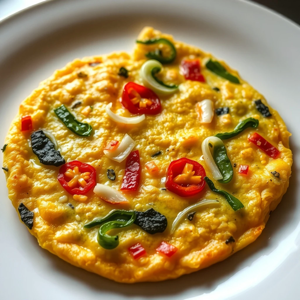 Vierte la mezcla de huevos y verduras en la sartén caliente. Extiende uniformemente para formar una tortilla redonda y de grosor parejo.
