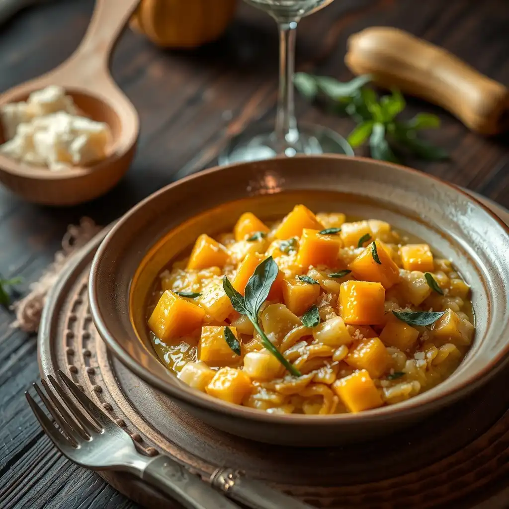 Incorporar los cubos de calabaza asada al risotto, reservando algunos para decorar. Añadir el resto de la mantequilla y el queso parmesano rallado. Revolver vigorosamente hasta que el risotto esté extra cremoso y brillante.