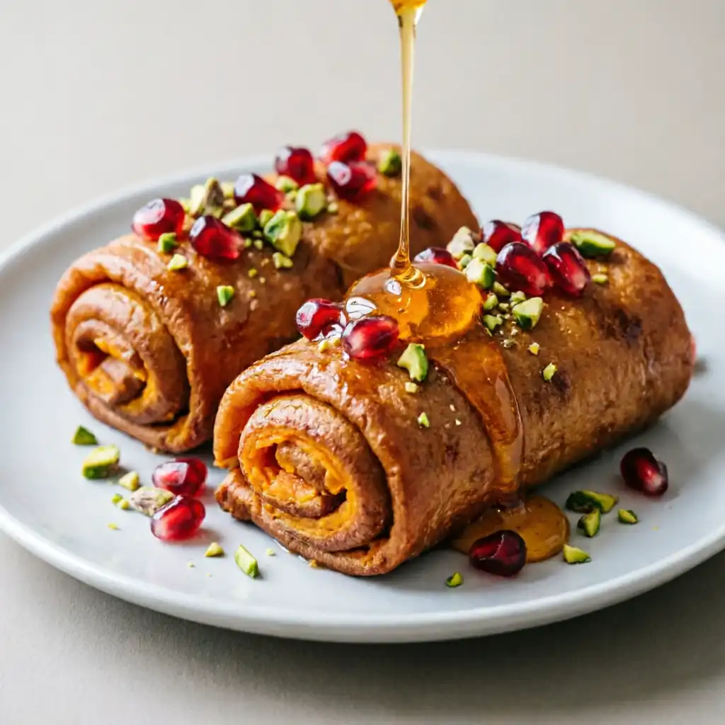 Espolvorea generosamente con los granos de granada fresca y los pistachos picados. Finaliza con las hojas de menta fresca picada para un toque de color y frescura.