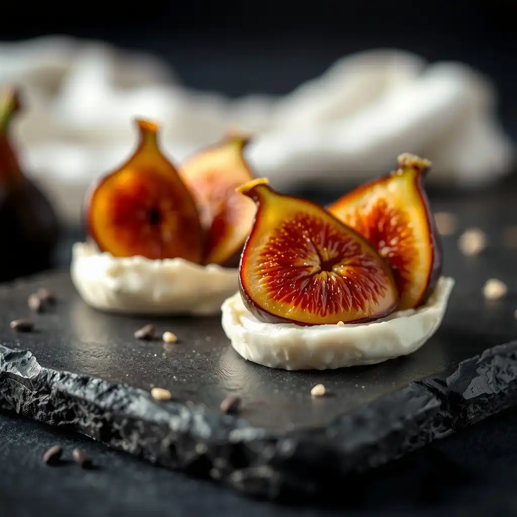 Toma una porción de la mezcla de queso y forma pequeñas quenelles o bolas. Coloca un higo confitado sobre cada porción de queso y decora con unas pocas semillas de sésamo negro.
