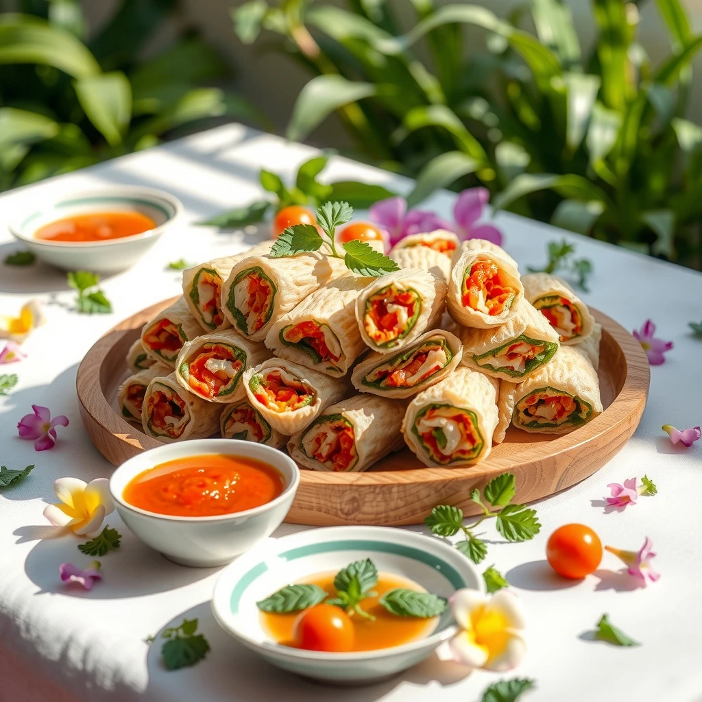 Sirve los rollitos primavera inmediatamente con la salsa preparada para mojar.