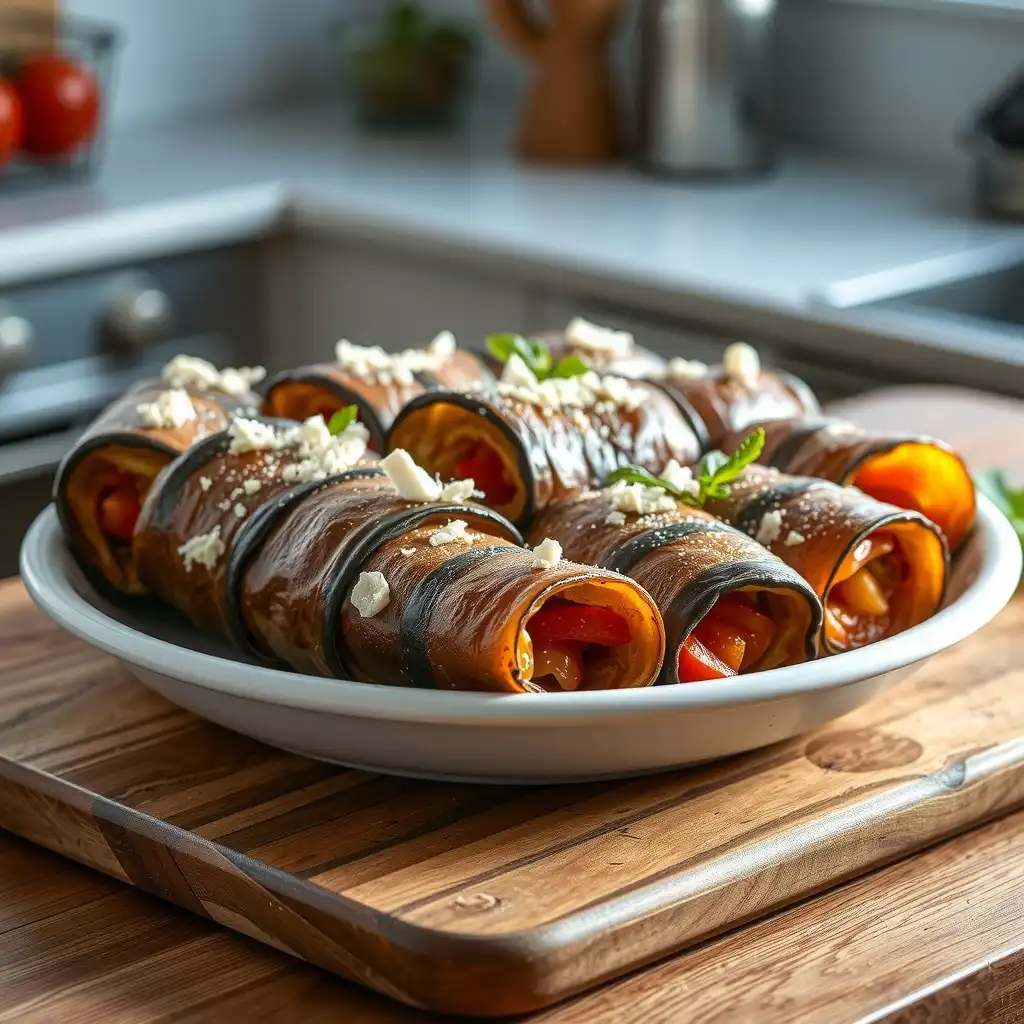 Enrolla la lámina de berenjena con cuidado para formar un rollito. Repite el proceso con el resto de las láminas y el relleno. Coloca los rollitos en una fuente de servir.