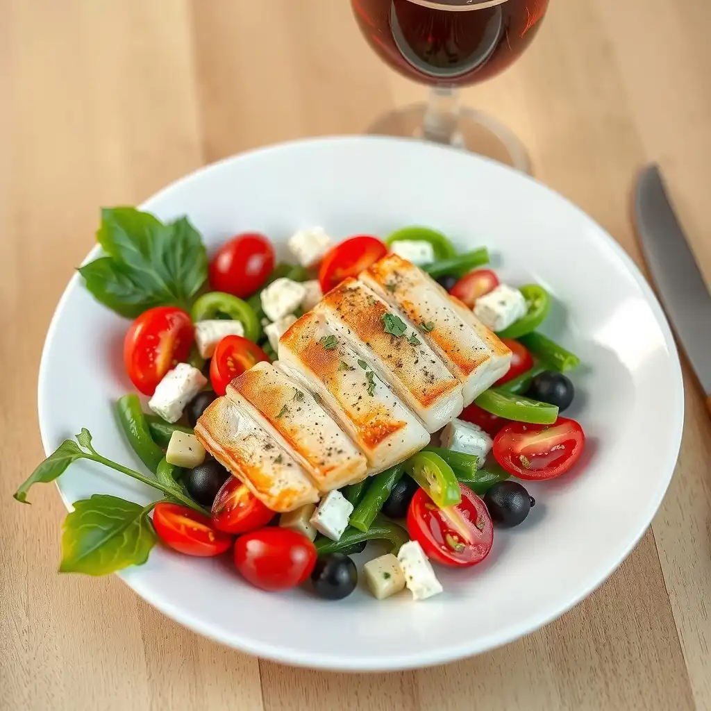 Sirve inmediatamente el salmón a la plancha sobre una porción generosa de la ensalada mediterránea preparada. Disfruta de una comida equilibrada y refrescante.