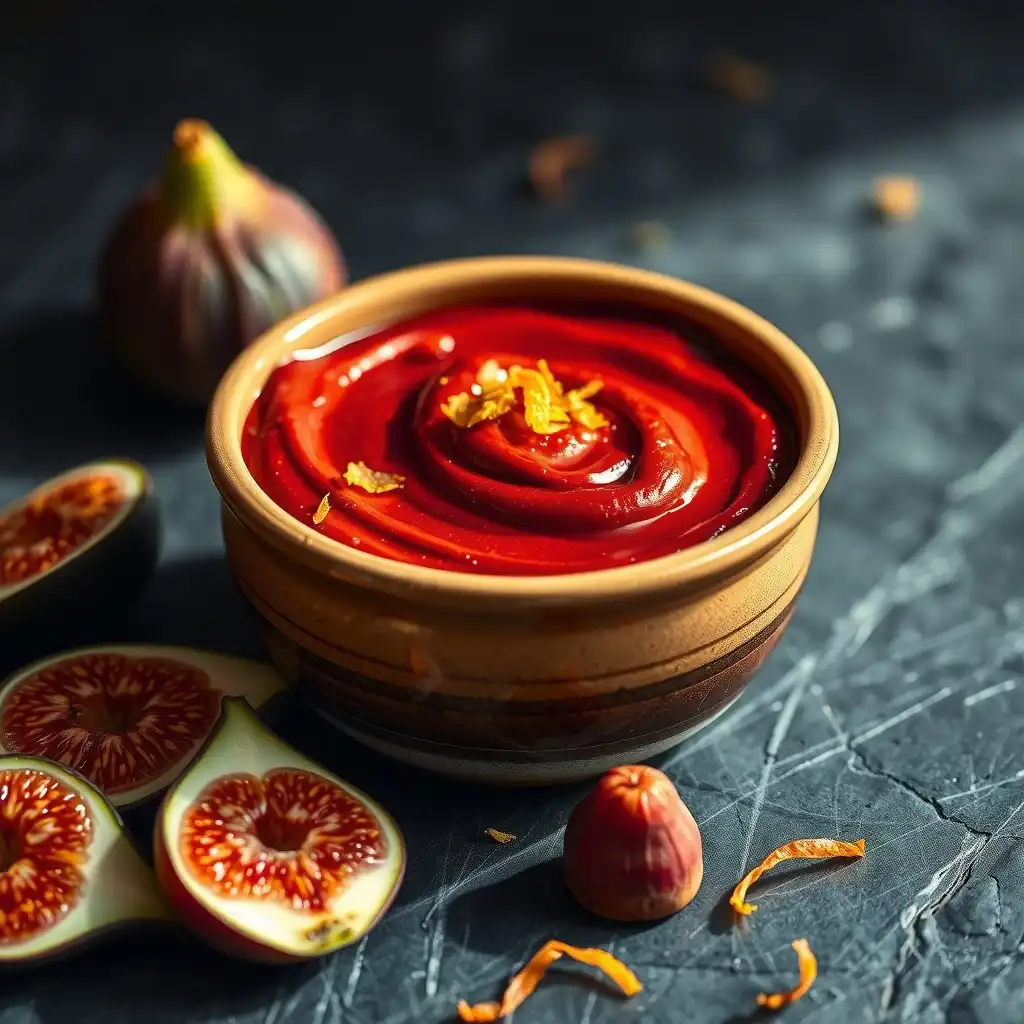 En un procesador de alimentos, combina la pulpa de pimiento asado, los higos frescos cortados, la ralladura de naranja, el vinagre de sidra, el sirope de agave y la sal.