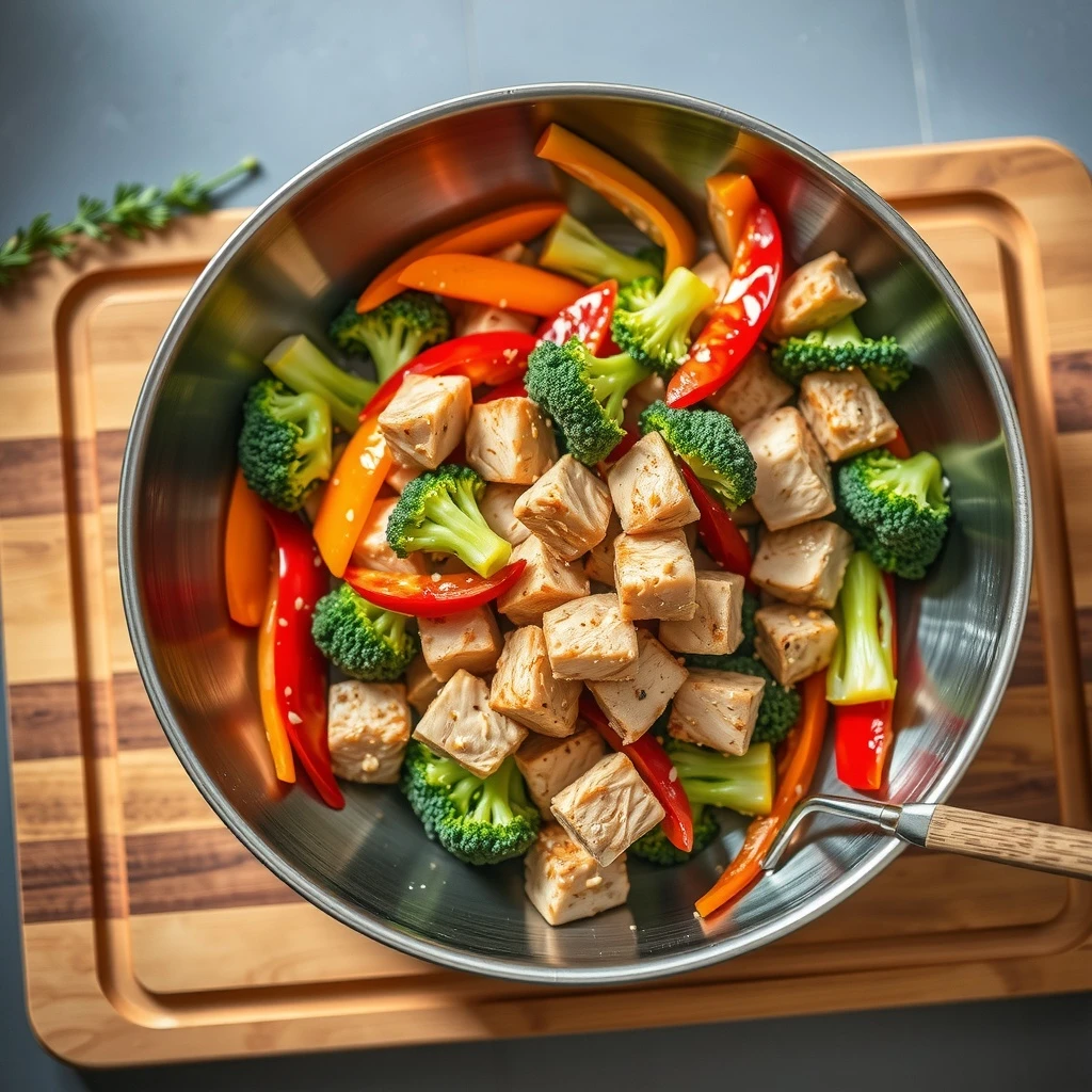 Calienta 1 cucharada de aceite de oliva en un wok o sartén grande a fuego medio-alto. Agrega el pollo marinado y cocina hasta que esté dorado y cocido por completo, aproximadamente 5-7 minutos. Retira el pollo del wok y reserva.