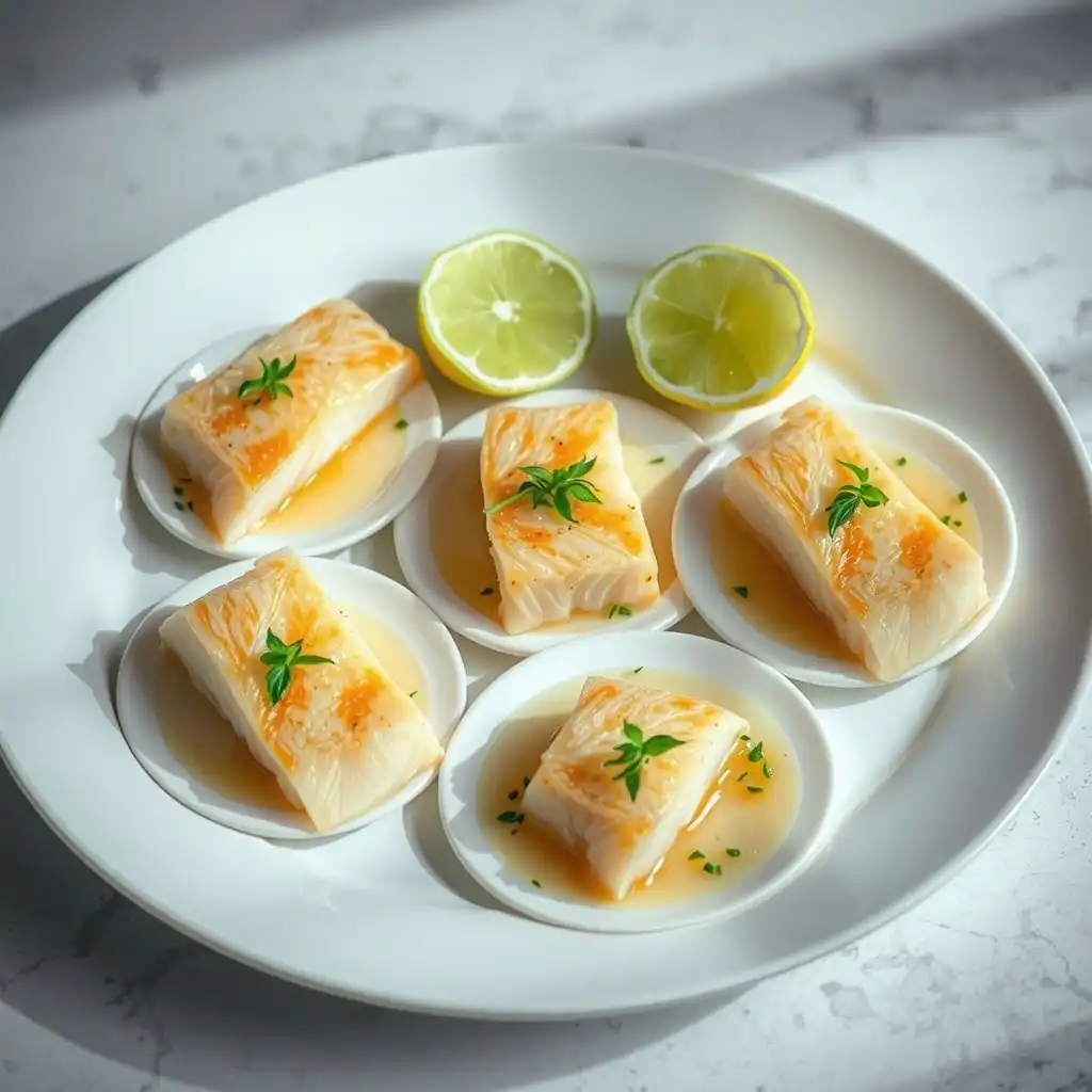 Servir inmediatamente cada filete de lubina bañado con la emulsión fresca de limón y aceite de oliva. Decorar con unas hojas de perejil fresco.