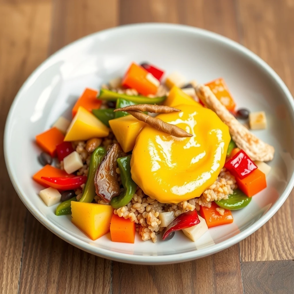 Servir el Tajín de Quinoa en platos individuales. Coronar cada porción con una generosa cucharada de alioli de azafrán y espolvorear con almendras tostadas.
